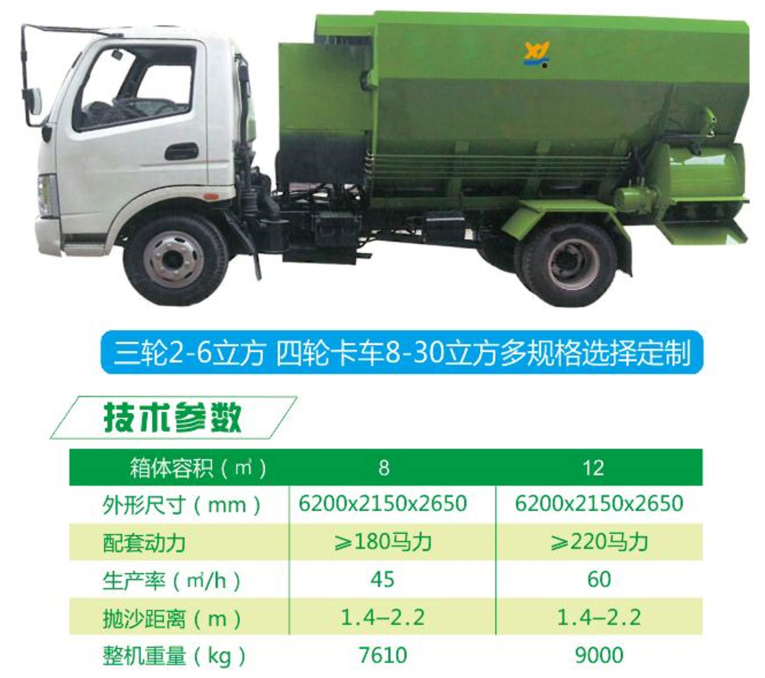 该车由机动牵引车和抛料系统两部分组成,采用低能耗,强度力的常柴等名牌发动机。加装大容量垂直式箱体,沙料采用螺旋式输送。